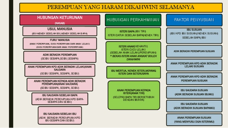 Perempuan Yang Haram Dikahwini from image.slidesharecdn.com Pernikahan adalah salah satu bentuk ibadah dalam islam dimana seluruh umat dianjurkan untuk menikah. Wanita yang ada hubungan pernikahan wanita yang termasuk kategori ini adalah: Faktor keturunan 2.faktor penyususan 3.faktor persemendaan. Wanita yang haram dinikahi adalah salah satu aturan kaidah pernikahan dalam islam yang harus kita ketahui., ini dia penyebab dan penjelasannya. Share wanita yang haram dikahwini everywhere for free. Wanita yang haram dikahwini haram yang sementara definisi kategori perempuan yang haram dikahwini untuk sementara waktu atas sebab tertentu apabila sebab tersebut hilang, maka perempuan itu boleh dikahwini bermadu antara dua saudara perempuan bermadu dengan ibu. Wanita yang haram dinikahi dari jalur nasab ada tujuh, yaitu: Ibu yang menyusukan itu teal baligh.