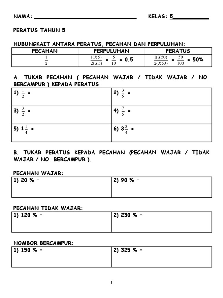 Latihan Peratus Tahun 5 / Peratus 1 Masmatik / Bidang nombor dan operasi tajuk 7) pecahan standard.