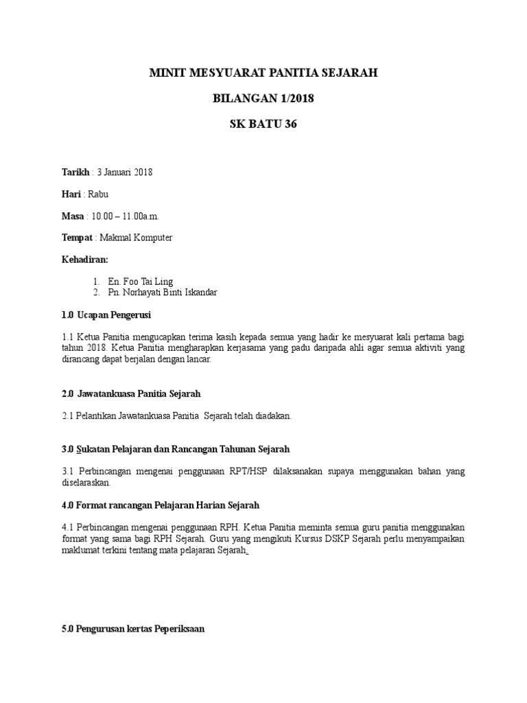 Related : Minit Mesyuarat Panitia Sejarah / Contoh Minit Mesyuarat Panitia BM Kali Pertama / Ucapan penasihat guru besar/wakil pentadbir..