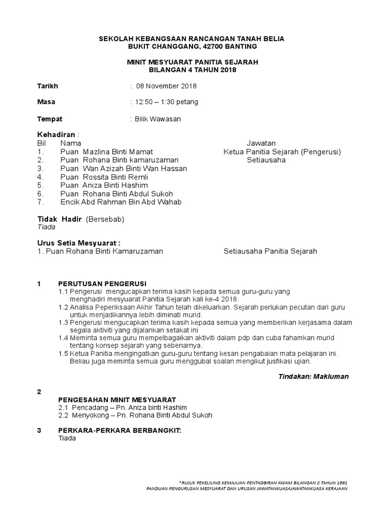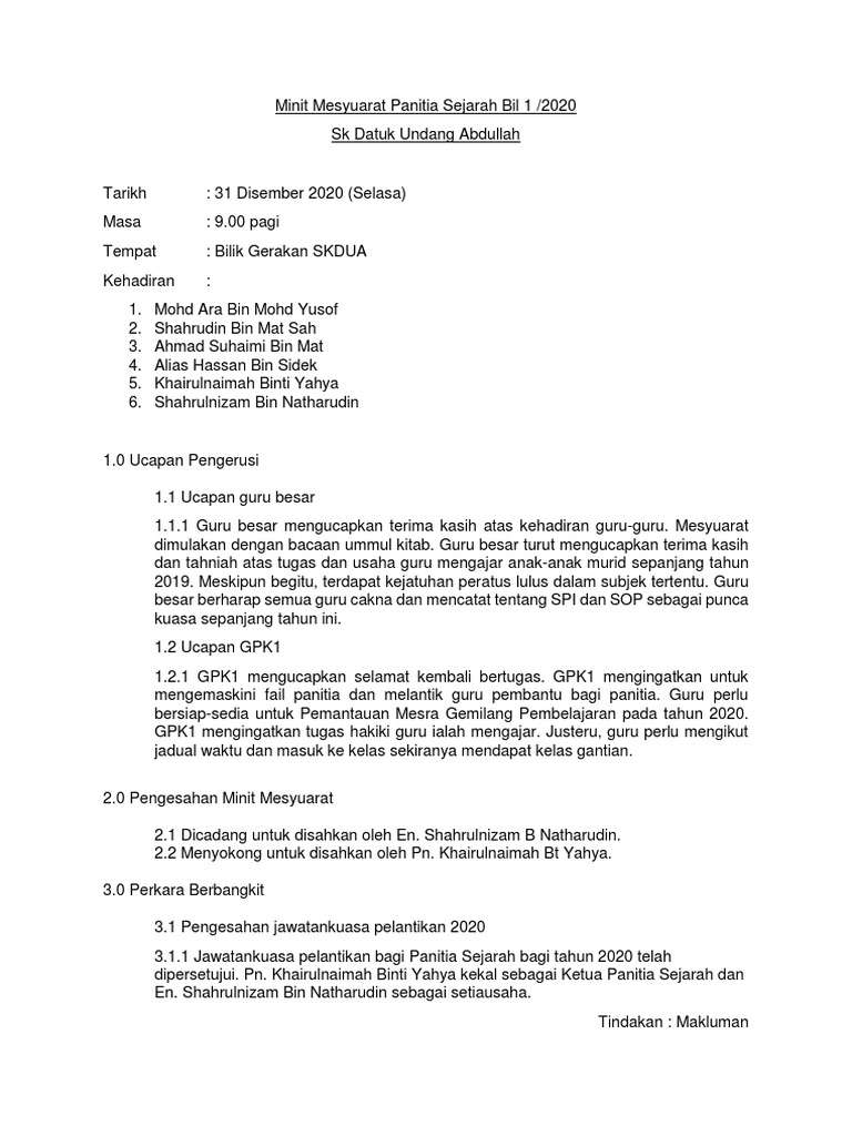 Minit Mesyuarat Panitia Sejarah Pertama 2017 from imgv2-1-f.scribdassets.com Pembentangan dan pengesahan minit mesyuarat yang lalu. {adab istikharah dan mesyuarat {adab me mberi dan men jawab salam s erta b ertemu dan. Program & aktiviti sekolah tahun 2021 三德国民型华文中学常年活动 #staysafe #stayathome #samtetdeliver #spm2020 #stpm2020 Contoh penulisan minit agenda mesyuarat kurikulum/panitia 1. Minit mesyuarat panitia (9) jadual kedatangan murid (10) gambar foto. Ucapan penasihat guru besar/wakil pentadbir.